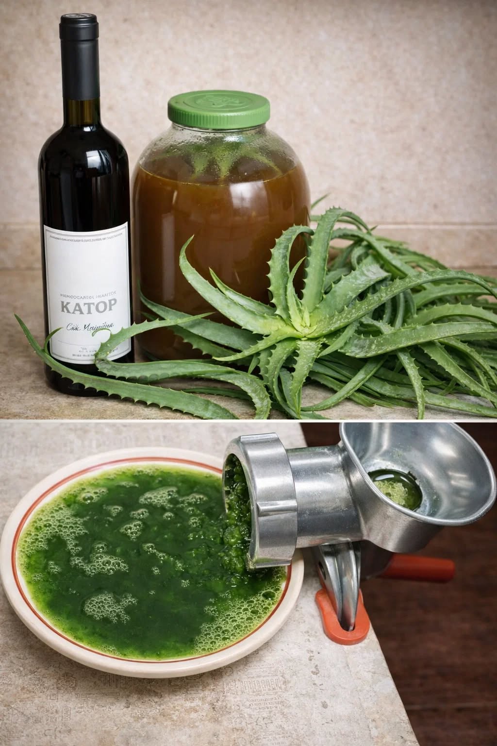 Вона взяла листя двох рослин алоє віком 4–5 років, які не поливали протягом 5 днів перед зрізанням. Листя промила, зняла шипи і пропустила через м’ясорубку. Вийшло близько 2 літрів м’якоті. Додала 3 кг меду і 2 пляшки кагора. Все ретельно перемішала в емальованій посудині, перелила в банки, загорнула в темну тканину та поставила в підпол.