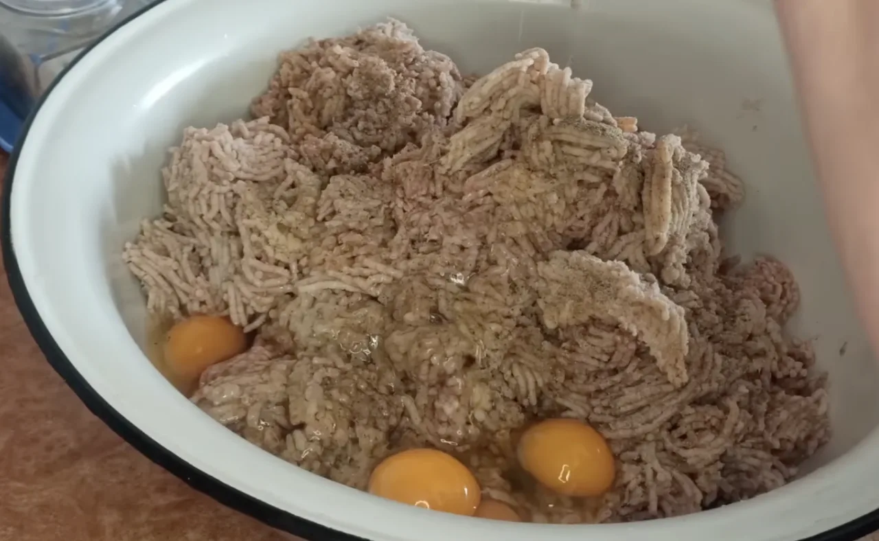 М’ясо, печінку та цибулю зі шкварками пропускаю через м’ясорубку з дрібним ситом. Батон змочую водою, віджимаю і теж пропускаю через м’ясорубку. Можна замінити на 4–5 ложок панірувальних сухарів. Додаю сіль, перець і яйця, все гарно перемішую вручну до ніжної, однорідної маси.