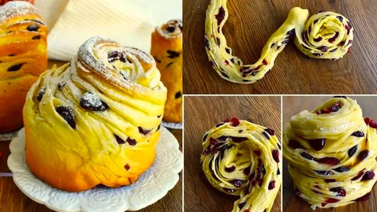 Ділю тісто на частини, розкочую пласт, змащую його м’яким вершковим маслом і викладаю родзинки та подрібнені волоські горіхи. Скручую в рулет, розрізаю вздовж, але не до кінця, і формую “шару”. Викладаю у форму так, щоб тісто займало 1/3 форми, залишаю піднятися.
