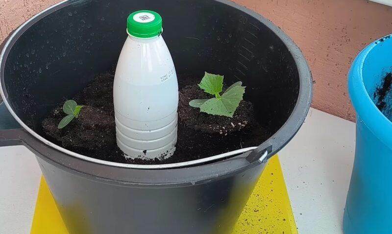 На цьому етапі робиться прикореневий краплинний полив: пластикова пляшка біля дна проколюється в двох місцях голкою і встановлюється по центру відра. Краплинний полив забезпечить поступове та регулярне надходження вологи до коріння огірків, що сприятиме їхньому активному зростанню та розвитку.