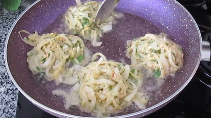 Розігрійте сковороду з достатньою кількістю олії. Викладайте по 1 повній столовій ложці цибульного тіста. Смажте на вогні трохи вище середнього до рум’яності з обох боків.