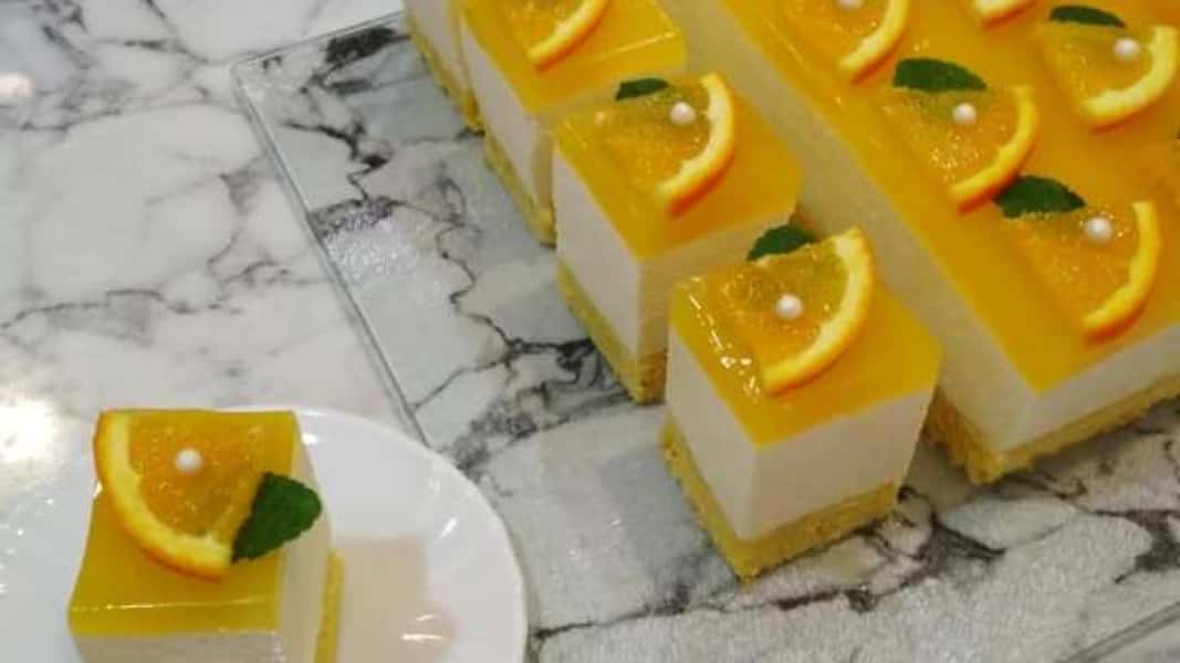Апельсиновий сік (200 мл) +25 г желатину дати набухнути. Розтопити, додати решту соку +цукор. Охолодити до кімнатної температури і виливаємо на сирну масу. Ставимо в холодильник на 4 години. Прикрашаємо дольками апельсина і листочками м’яти і ріжемо порційними шматочками.