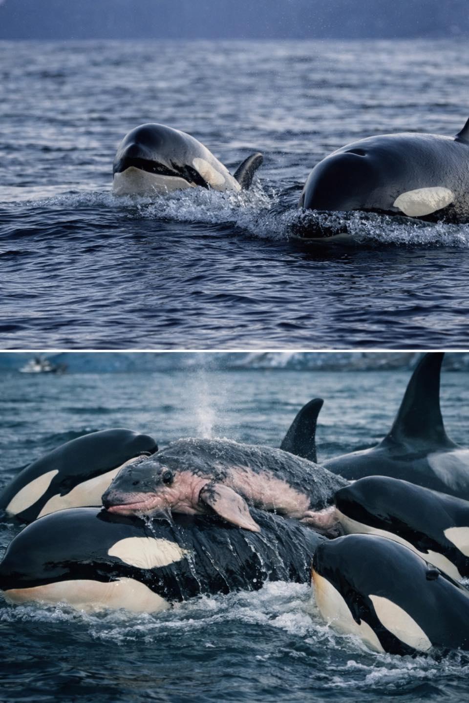 Дорослі косатки та молодь зграї утворили коло навколо щойно народженого маляти, оберігаючи його з майже хореографічною точністю. Потім, ніби рухаючись в унісон, вони допомогли йому піднятися на поверхню, де воно зробило перший подих у своєму житті. Простий, але життєво необхідний жест, який значно підвищив шанси маляти на виживання.