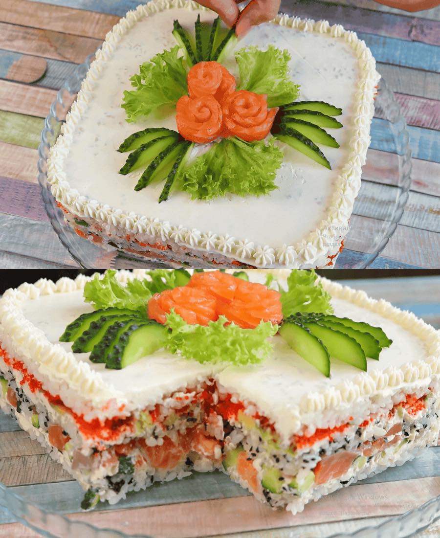 Через час видаляємо форму. Зверху рис змащуємо сиром Філадельфія ( 50-80 г ), потім по краях робимо квіточки ( 50 г ). Прикрашаємо торт червоною рибою, листям салату і огірком.